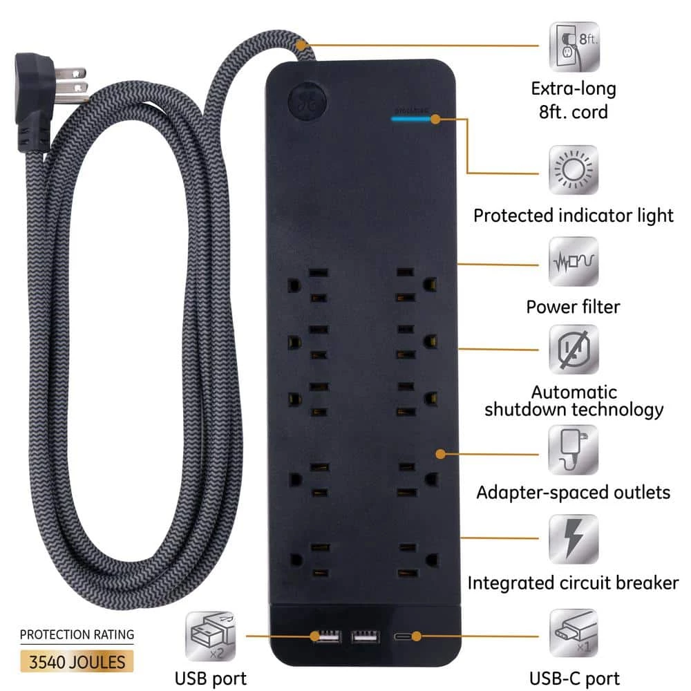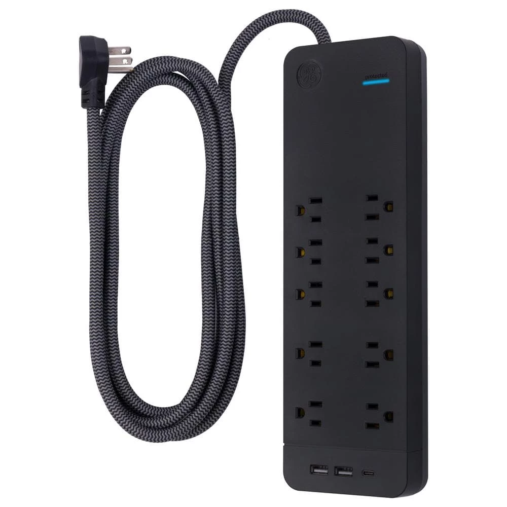10-Outlet 2 USB-A 1 USB-C Surge Protector with 8 ft. Braided Cord, Black
