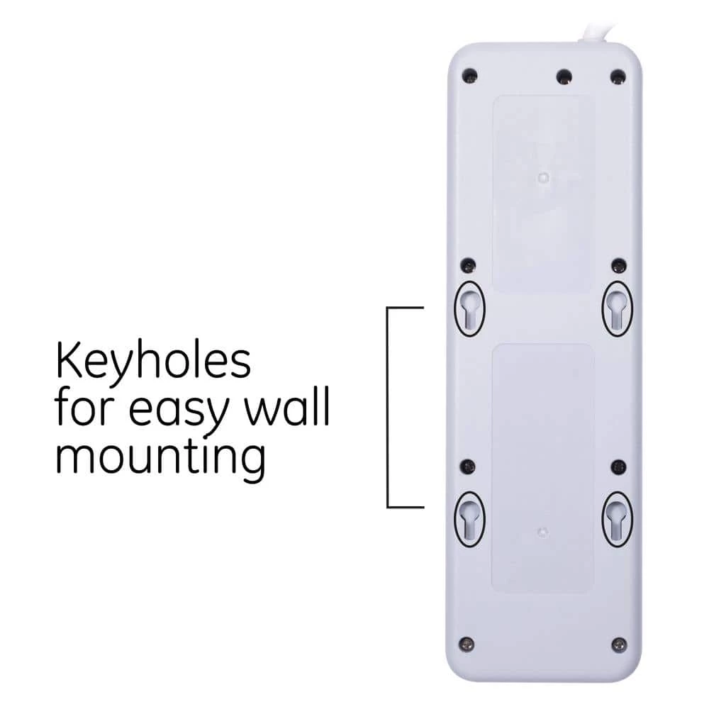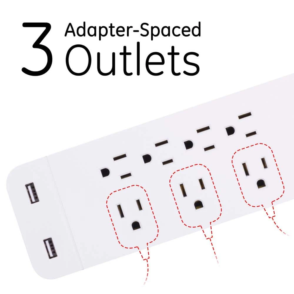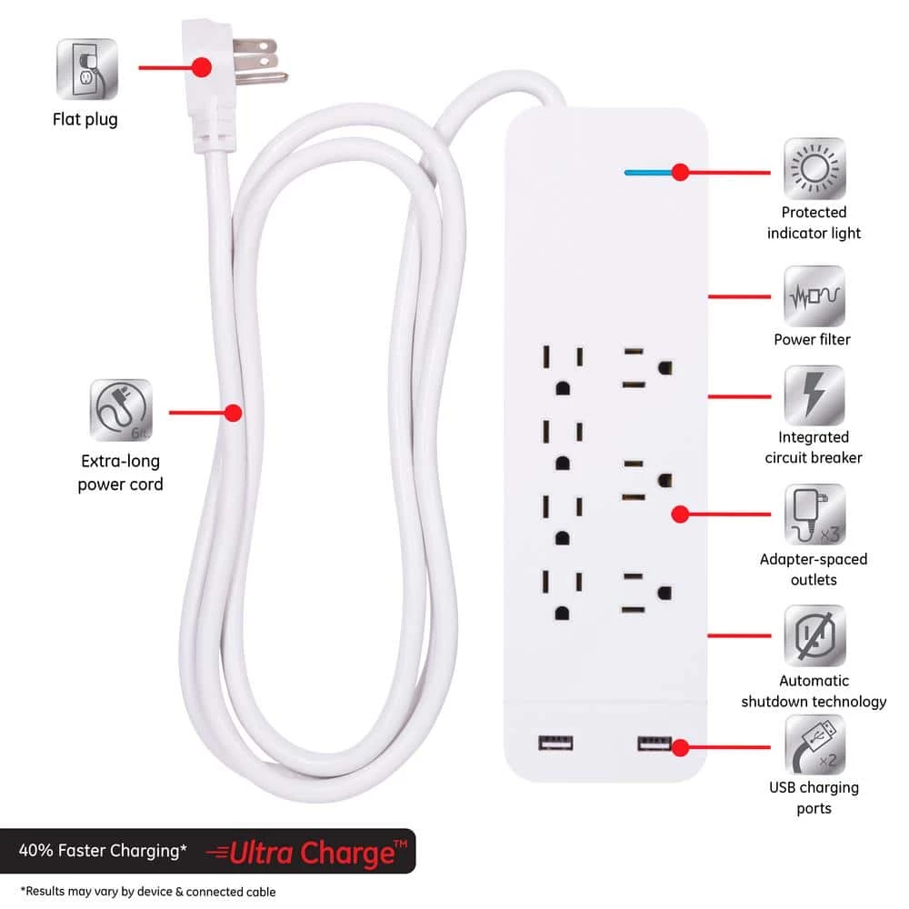Protect your electronics and charge your portable devices at the same time with the GE Ultra Pro surge protector, 7-outlets + 2 USB charging ports. The premium surge protector Features 7 protected-outlets with 3 spaced for adapters, 2 USB charging ports and a 6 ft. power cord. You can rapidly charge your mobile devices while other electronics are connected because of the powerful 2.4 Amp USB ports. The surge protector has a protected indicator light which shows the protection components are working. It also houses an integrated circuit breaker for overload protection. In the event the protection capacity is exceed by a power surge, the indicator light will not be lit and the power will be permanently shut down to the-outlets, ensuring the protection of your electronics. For those electronics, such as TVs and stereo equipment, the surge protector Features a power filter which reduces interference to provide a cleaner sound and picture experience.