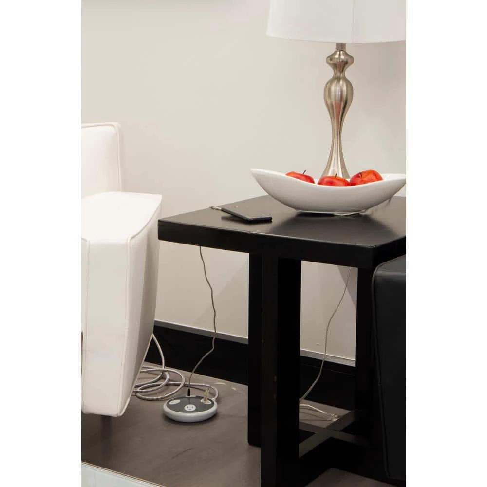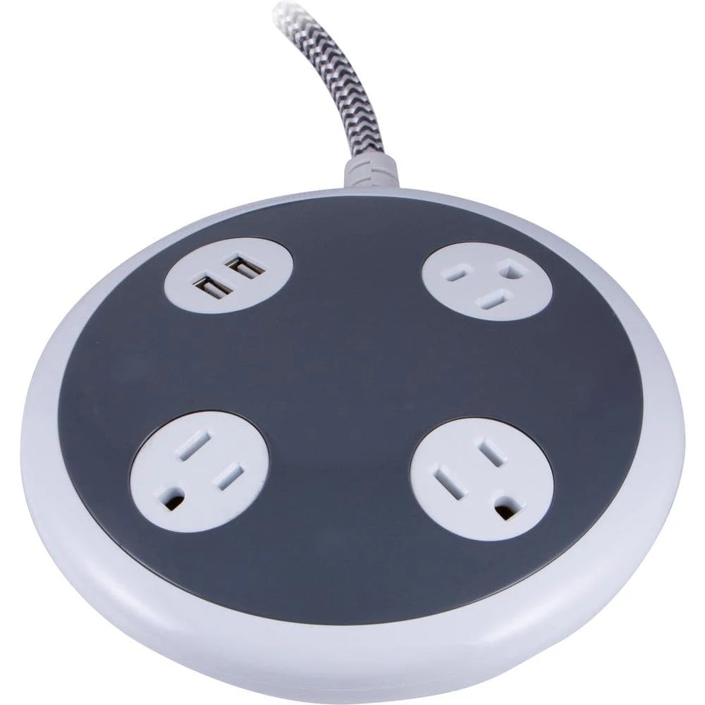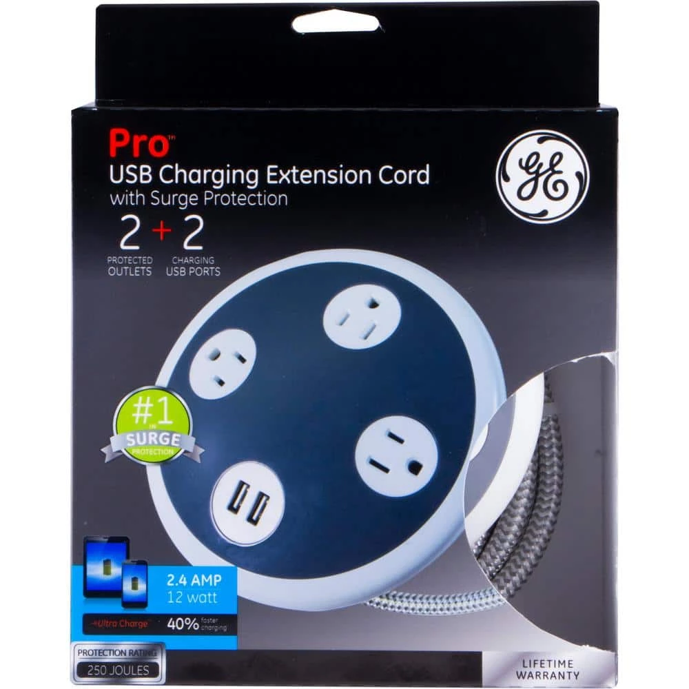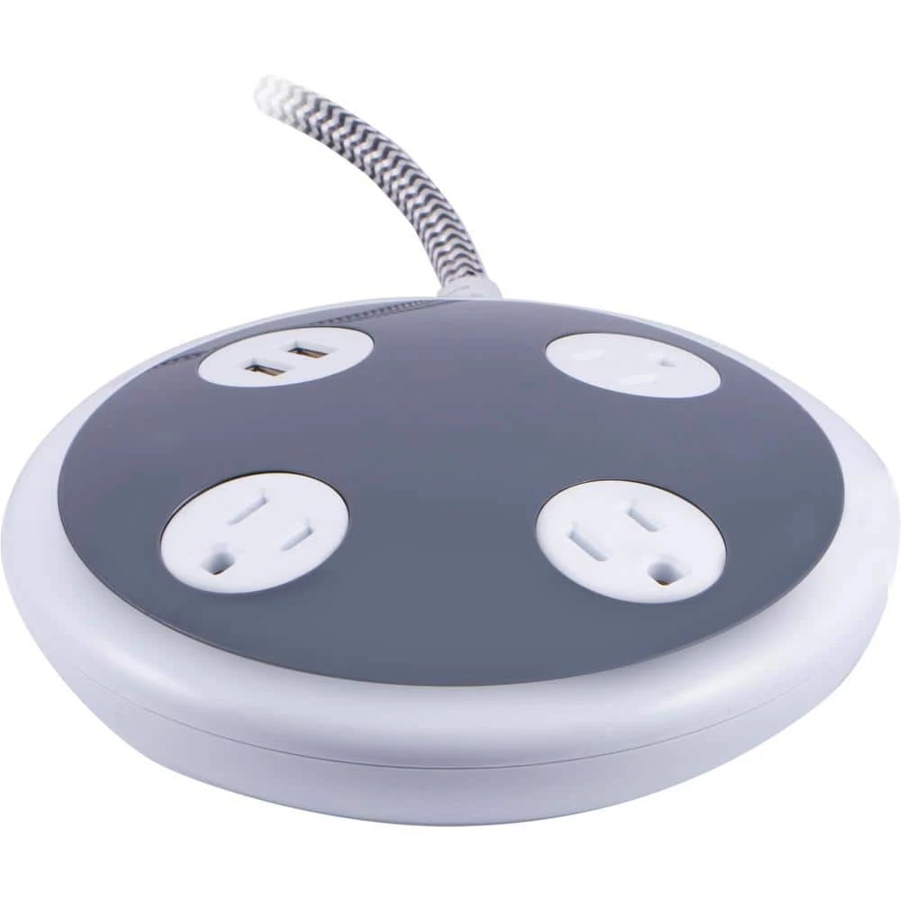 Connect your devices confidently with a GE-branded 3-Outlet 2-USB Port Surge Protector. Featuring three grounded AC outlets with 450 Joules of surge protection and two standard USB ports providing 2.4 Amp of charging power, the surge protector transforms your regular outlet into a safe, organized powering station. The unique, circular design of the surge protector is perfect for a conference room setup, home office or entertainment center. Additionally, the surge protector comes with an extra-long, 8 ft. braided power cord the decorative, woven fabric increases the cables durability, is tangle-free and adds instant style to your space. The cord cover comes in an attractive gray and white chevron pattern with a sleek gray and white finish on the surge orb. The cord is connected to a flat plug, allowing the surge protector to fit easily behind desks, sofas and other furniture. Get the most from your outlet with a GE-branded 3-Outlet 2 USB Port Surge Protector.