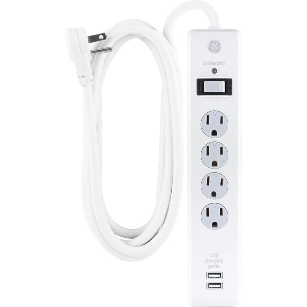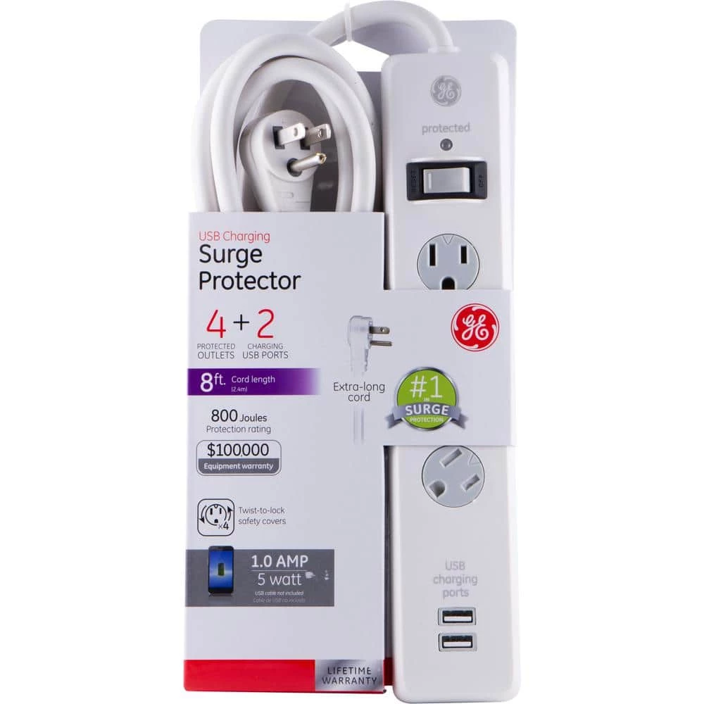 Power multiple devices at one time with a GE-branded 4 Outlet, 2 USB Surge Protector. Featuring four grounded outlets with 800 Joules of surge protection and two standard USB ports providing 1.0 Amp of charging power, the surge protector transforms your regular outlet into a versatile, efficient charging station. The surge protector is the perfect addition to any home office, entertainment center or work space. For overload protection, the surge protector includes an integrated circuit breaker. The surge protector features automatic shutdown technology to stop power to your devices once surge protection expires. The extra-long 8 ft. power cord provides you with the additional length you need to reach around furniture and is connected to a flat plug, allowing the surge protector to easily plug in behind desks, sofas, and other home and office furniture. The surge protector also has an LED indicator light to show your surge protector is functioning properly. Get the most from your outlet with a GE-branded 4 Outlet, 2 USB Surge Protector.