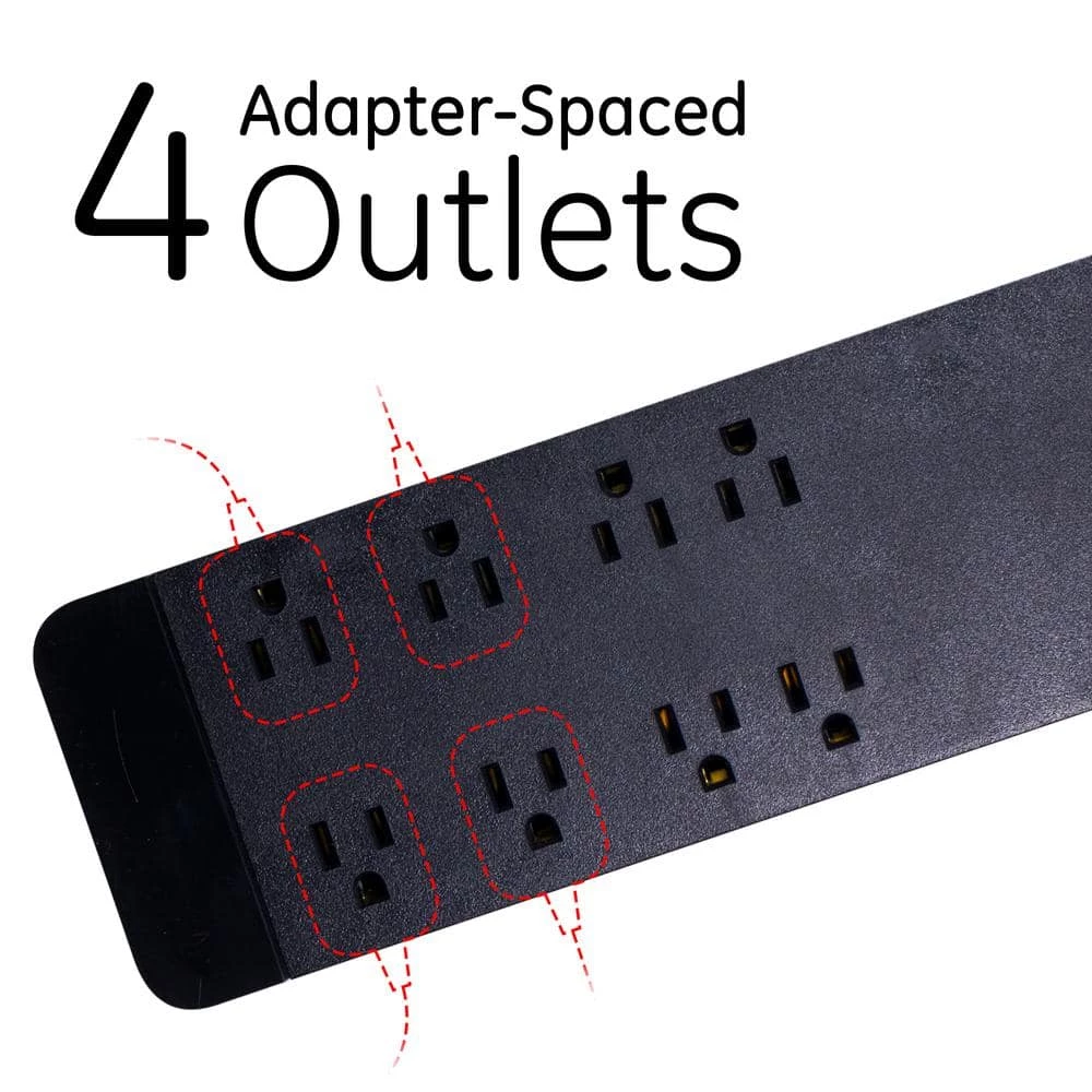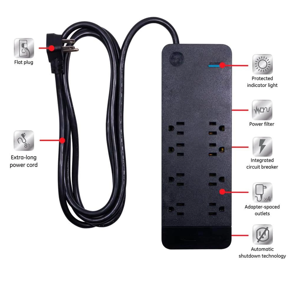 Add versatility to your electrical outlets while protecting your household electronics with the GE-branded 8-Outlet Pro Surge Protector. Converting one three-prong outlet into eight, this powerful extension cord adds more outlets where you need them most and keeps your electronics protected from dangerous power surges. Four adapter-spaced outlets provide plenty of space for those bulky adapters. The surge protector features an integrated circuit breaker, automatic shutdown technology, a surge protection rating of 2,160 Joules and a protected indicator light that shows the surge protector is working properly. The surge protector comes in a black finish and features an extra-long 8ft. heavy-duty cord, a built-in power filter and space-saving flat plug to allow the power cord to sit close to the wall. For use in grounded (three-prong) outlets only, this product comes is backed by a hassle-free limited-lifetime replacement policy. For the ultimate peace of mind, put your trust in the GE-branded 8-Outlet Pro Surge Protector.