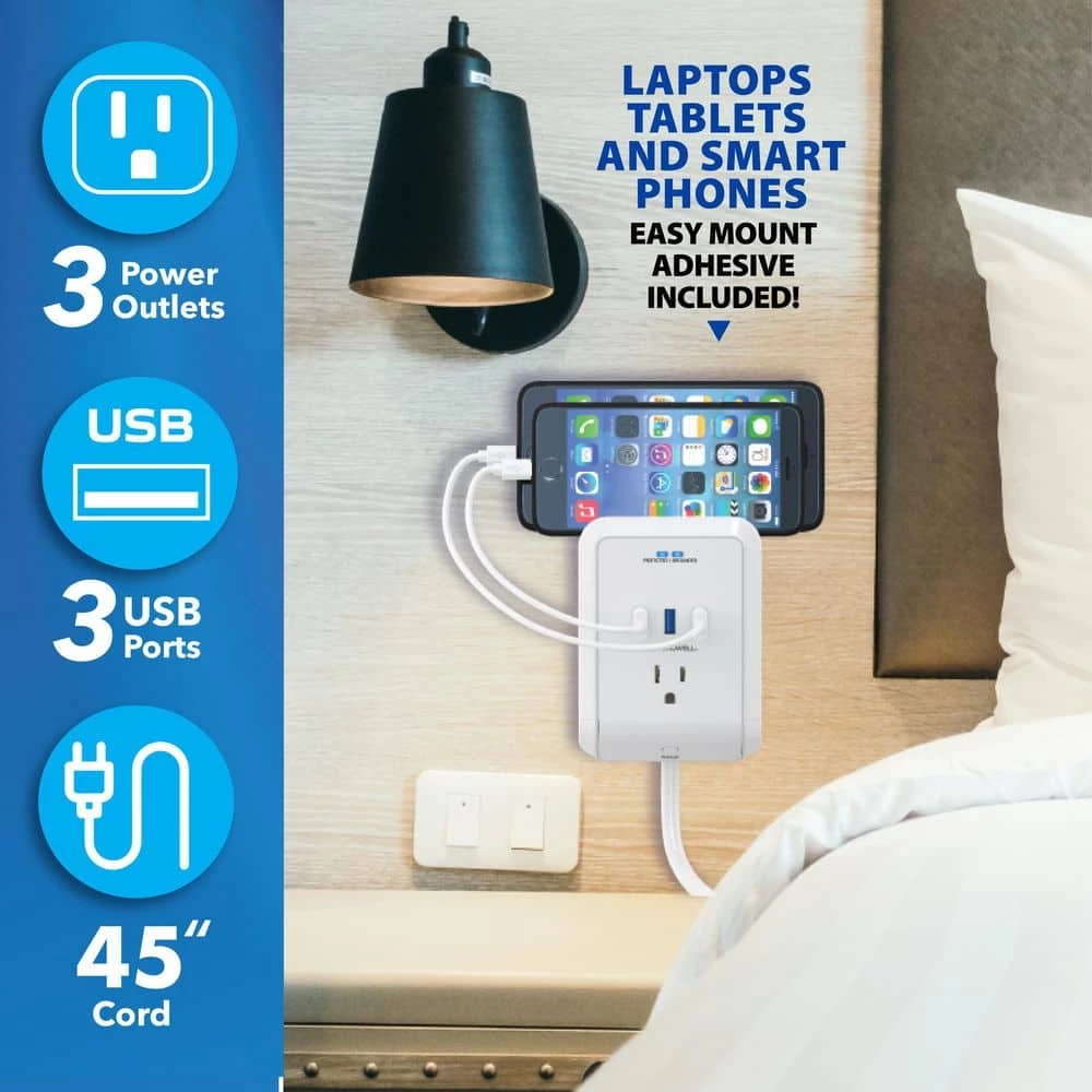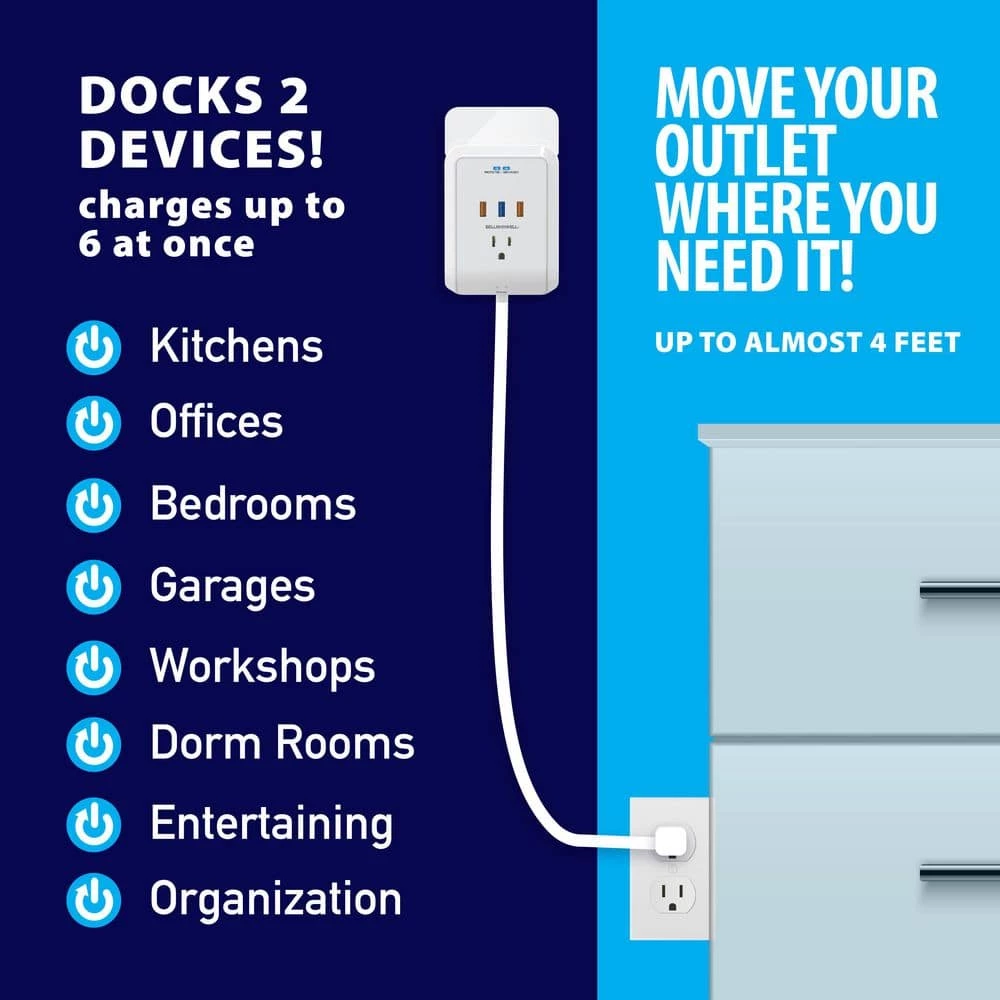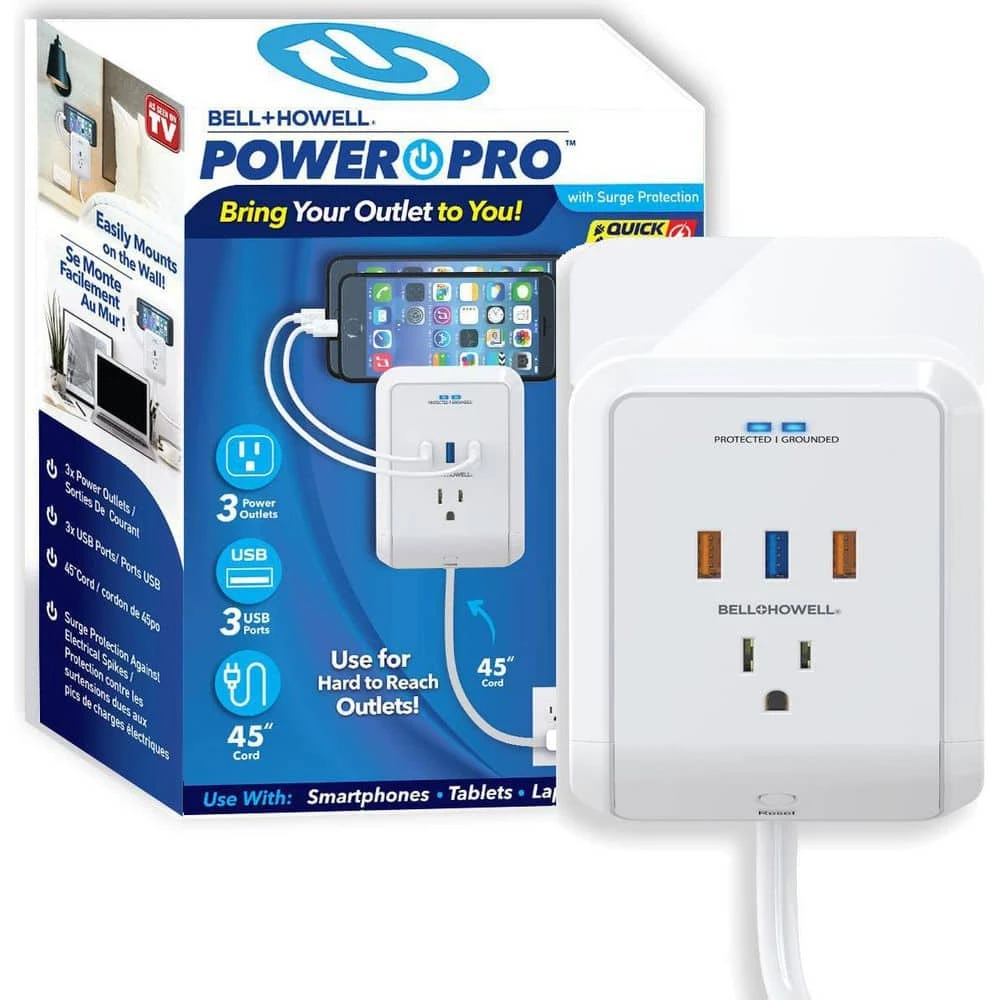 Bell + Howell Power Pro: Tired of having out-of-reach unused outlets behind beds, dressers and cabinets. The Bell + Howell Power Pro allows you to move your outlet wherever you need it, with a 4 ft. extension cord. It also gives you 3 outlets and 3 USB ports instead of just one outlet and is surge protected. You can easily mount the Power Pro anywhere with the included quick mount adhesive or screws.
