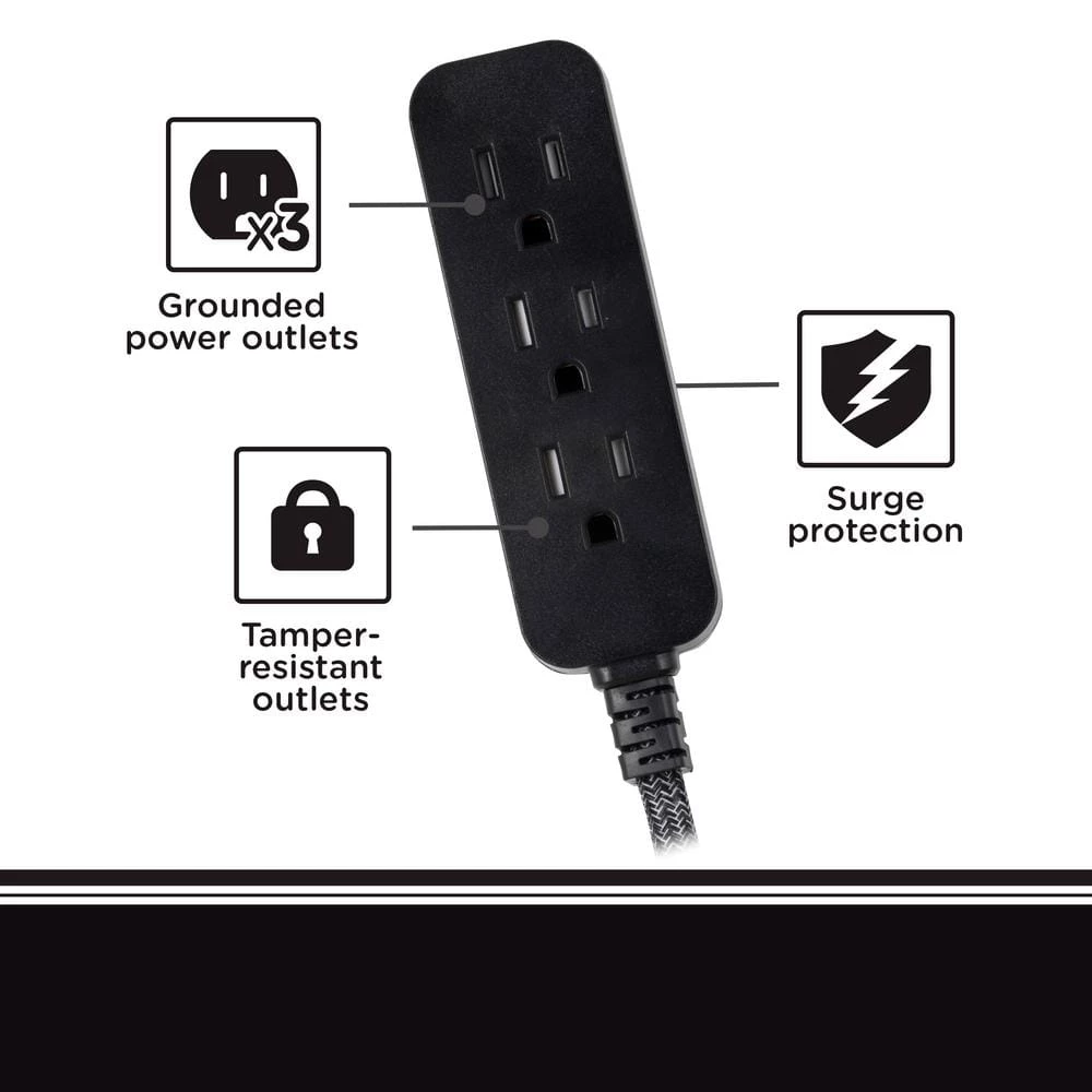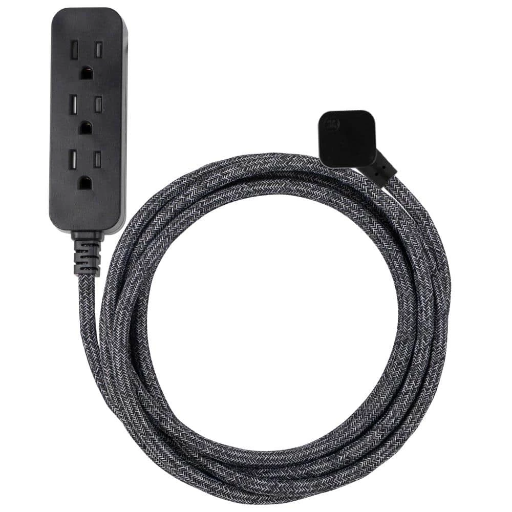 Extend your style into the future with the Cordinate 3-Outlet Extension Cord. While most cords interrupt or distract from your home’s décor, this unique designer cable only contributes to the overall charm of your space. The 10ft. woven black and gray heather fabric cord cover accents your home or work setup. The extra layer of fabric not only increases the cable’s durability, but also keeps the cord from being bent and tangled. The thoughtful construction of the extension cord includes a space-saving flat plug, making it convenient to connect your devices where space is limited. For added protection, the extension cord includes built-in surge protection to ensure that your connected equipment stays safe from harmful voltage spikes. For a premium design that offers equal parts fashion and function, choose the Cordinate 3-Outlet Extension Cord.
