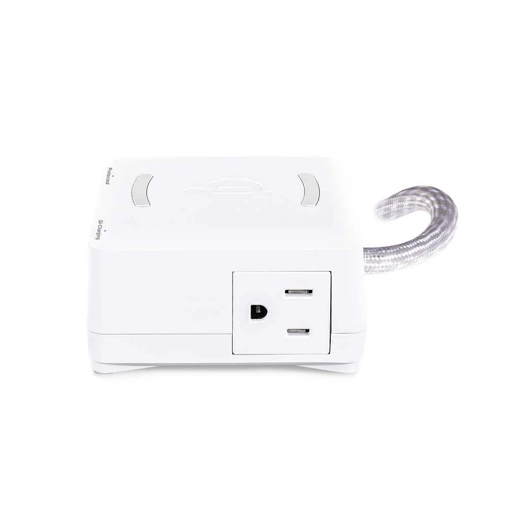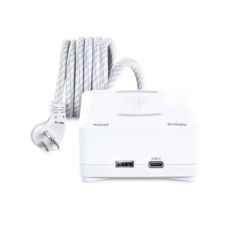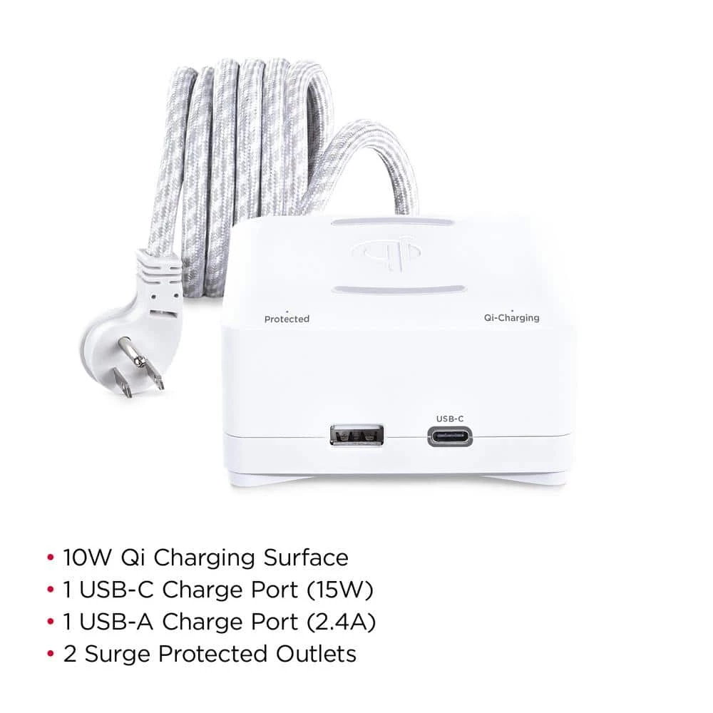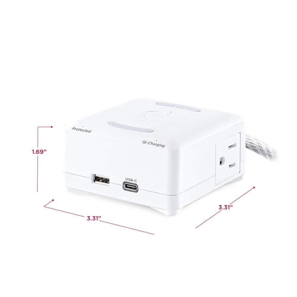 The CyberPower desk top charger P205UCQ brings you power, protection and versatility – all-in-1 compact unit. The P205UCQ desk top charger features 2 AC power outlets with 1500J of surge protection, 1 USB-A charging port, 1 USB-C charging port and a 10-Watt wireless Qi charging pad. Perfect for desk tops, table tops or other high-traffic areas of the home or office, the P205UCQ meets today’s diverse power needs. 2 outlets on each side of the charger keep cords organized while providing 1500 Joules of surge protection. The stylish, braided power cord stores easily, resists tangles and looks great. The low-profile, right-angle power plug fits into tight places. 1-year limited warranty included. $100,000 Connected Equipment Guarantee.