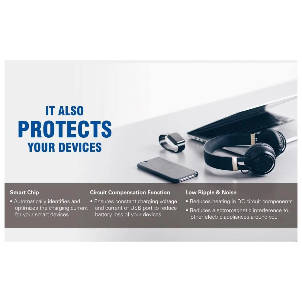 - Circuit compensation function – ensures constant charging voltage and current of USB port to reduce battery loss of your devices