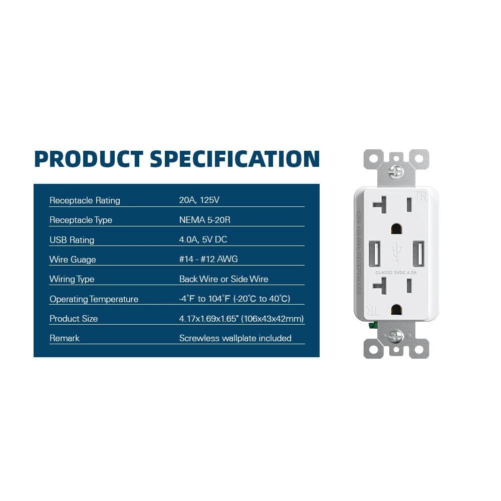 - High-Speed Charging Tech – in-wall duplex receptacles with two USB outlets with a total output of 4.0 Amp (2.0A standalone), 5V DC