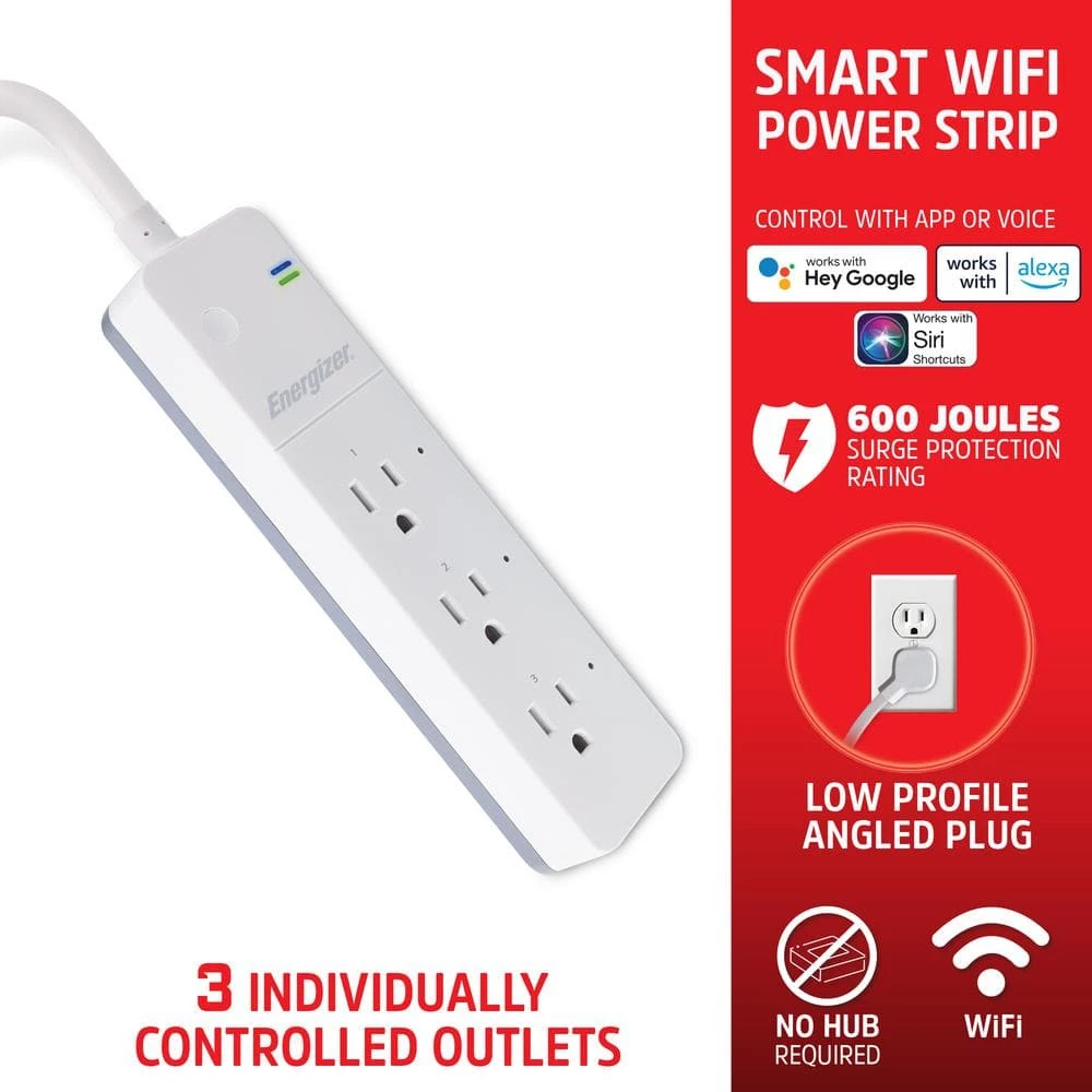 The Energizer Smart Wi-Fi 3 Outlet Power Strip provides a convenient way to keep multiple items working when needed. Beyond a basic power strip, you can use the downloadable Energizer Connect App to create custom schedules based on your daily routine. Turn on or off any connected items with a simple tap to better manage your power needs. Our strip links with Alexa, Siri and Google Assistant to provide you with voice control if you want to utilize it. The item is 600 Joules certified to protect against power surges and other spikes while they’re connected. You’ll be able to connect to your own Wi-Fi setup without a complicated hub. Keep your devices powered when you need them with the Smart Wi-Fi 3 Outlet Power Strip from Energizer.