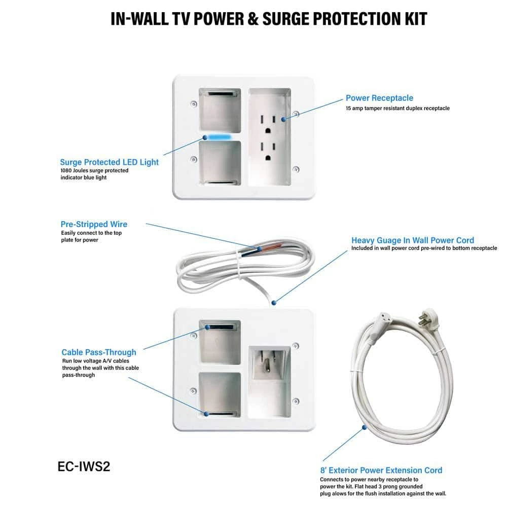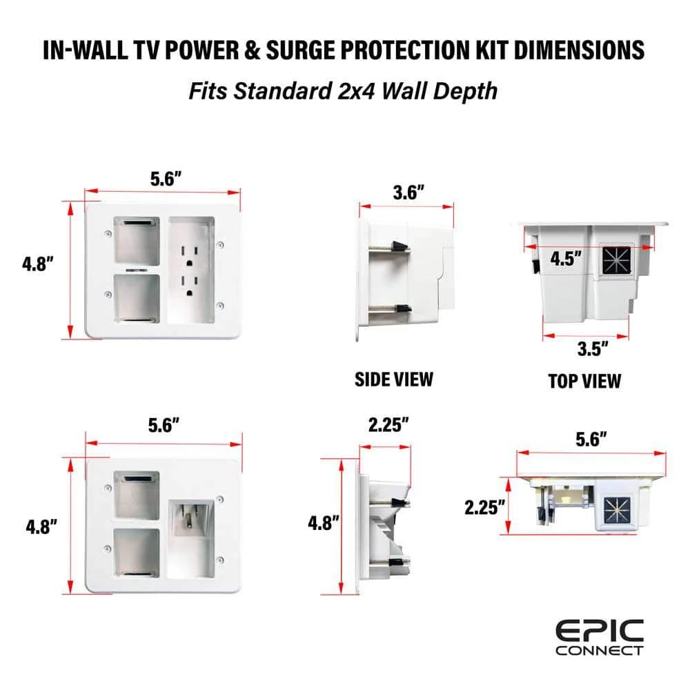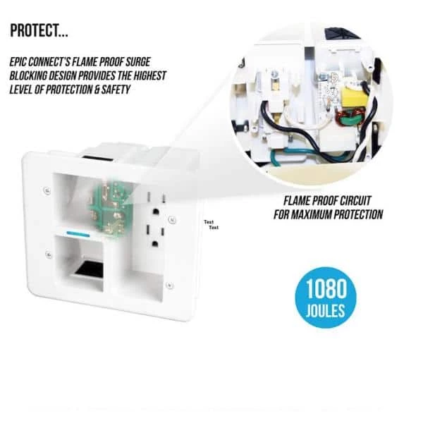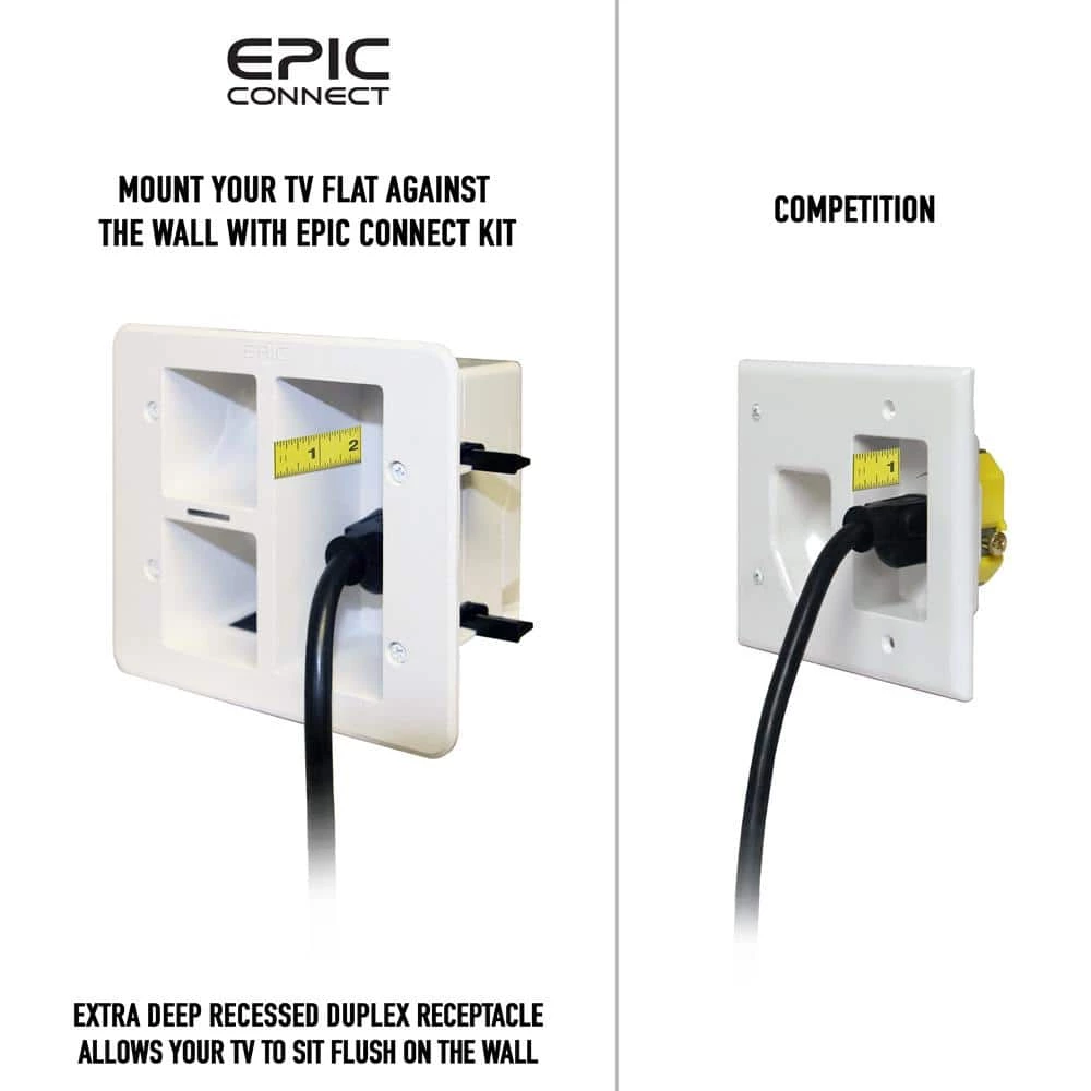 The UL-Certified Epic Connect Surge Protected In-Wall Power Conditioner Kit offers the best of both worlds-professional grade surge protection and noise filtration-so TV’s and Audio / Video equipment are highly protected and operate effectively. The recessed design is perfect for fitting behind ultra-thin flat-panel TV’s. Lower recessed outlet box and extension cable included for easy connection to standard wall outlet. Epic Connect-Your Conceal-Connect-Protect total solution.