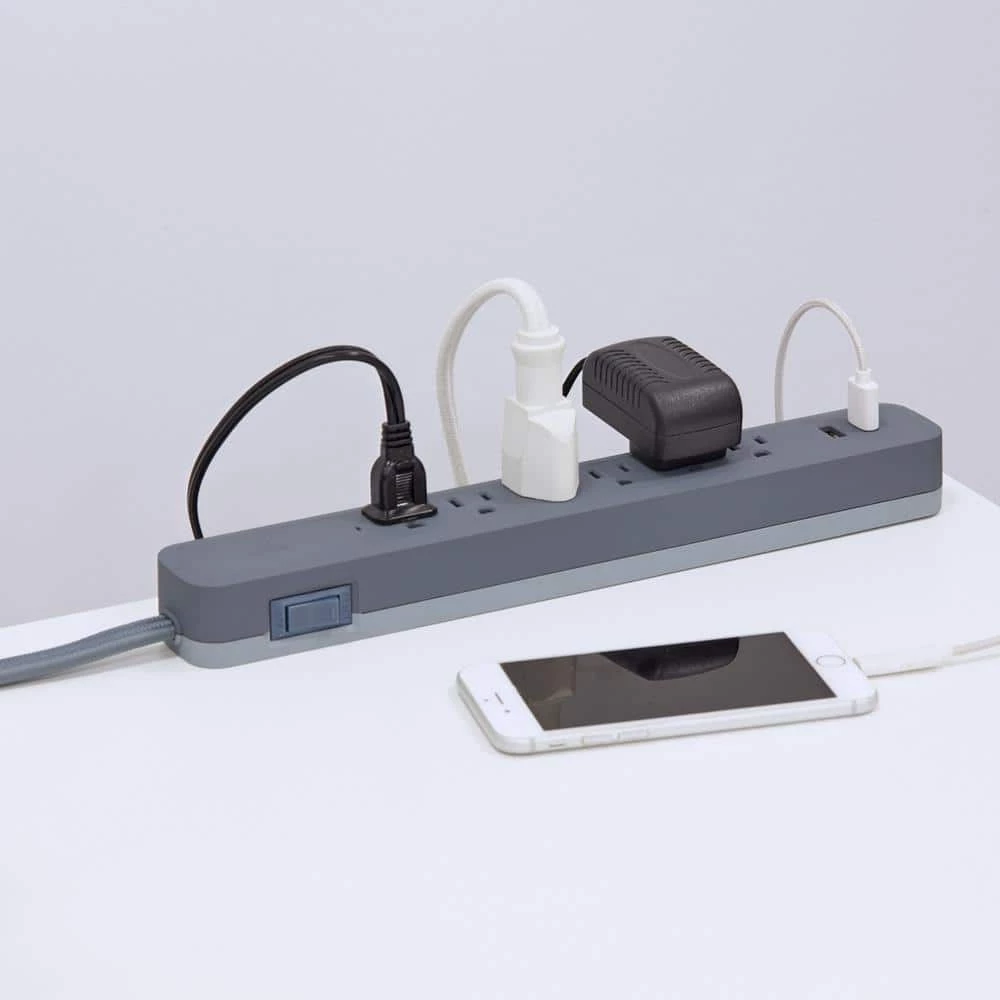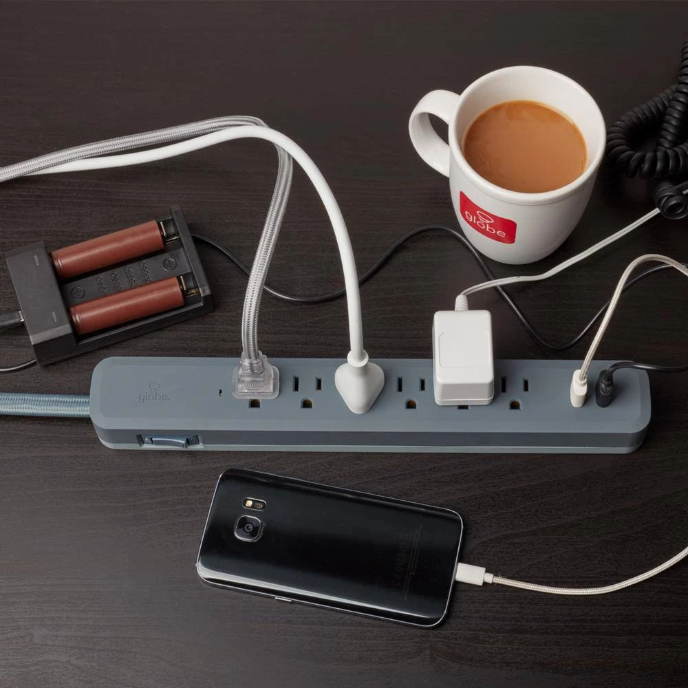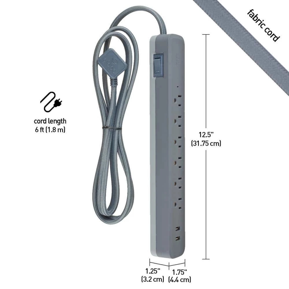 The original Globe Electric Designer Series 6 ft. 6-Outlet Surge Protector Power Strip with 2 USB Ports and a Circuit Breaker Switch was specifically designed to eliminate the unsightly traditional power bar and replace it with one you’ll want to show off. The added convenience of the handy space saver right angle plug allows your furniture to sit flush to the wall – creating more space without bent wires. A 6-foot fabric covered cord gives you the added convenience of increased range from power outlets. The six grounded outlets are perfect to use with small appliances and electronics such as lamps, computers, printers and home theatre systems. The 3.1 Amp combined USB ports ensure a fast charge for your devices. Compatible with smartphones (Android, iPhone), tablets (iPad, Android, Surface), eReaders (Kindle, Kindle Fire), cameras and more. Surge protected to 1200 joules, you can rest assured that your small electronics are safe while plugged in. Plus, the handy circuit breaker switch allows you to easily save power consumption and turn off all electronics with the flick of a switch. Recommended for indoor use. Patent pending.