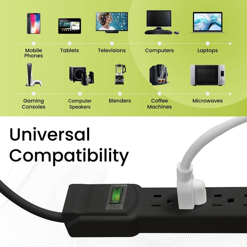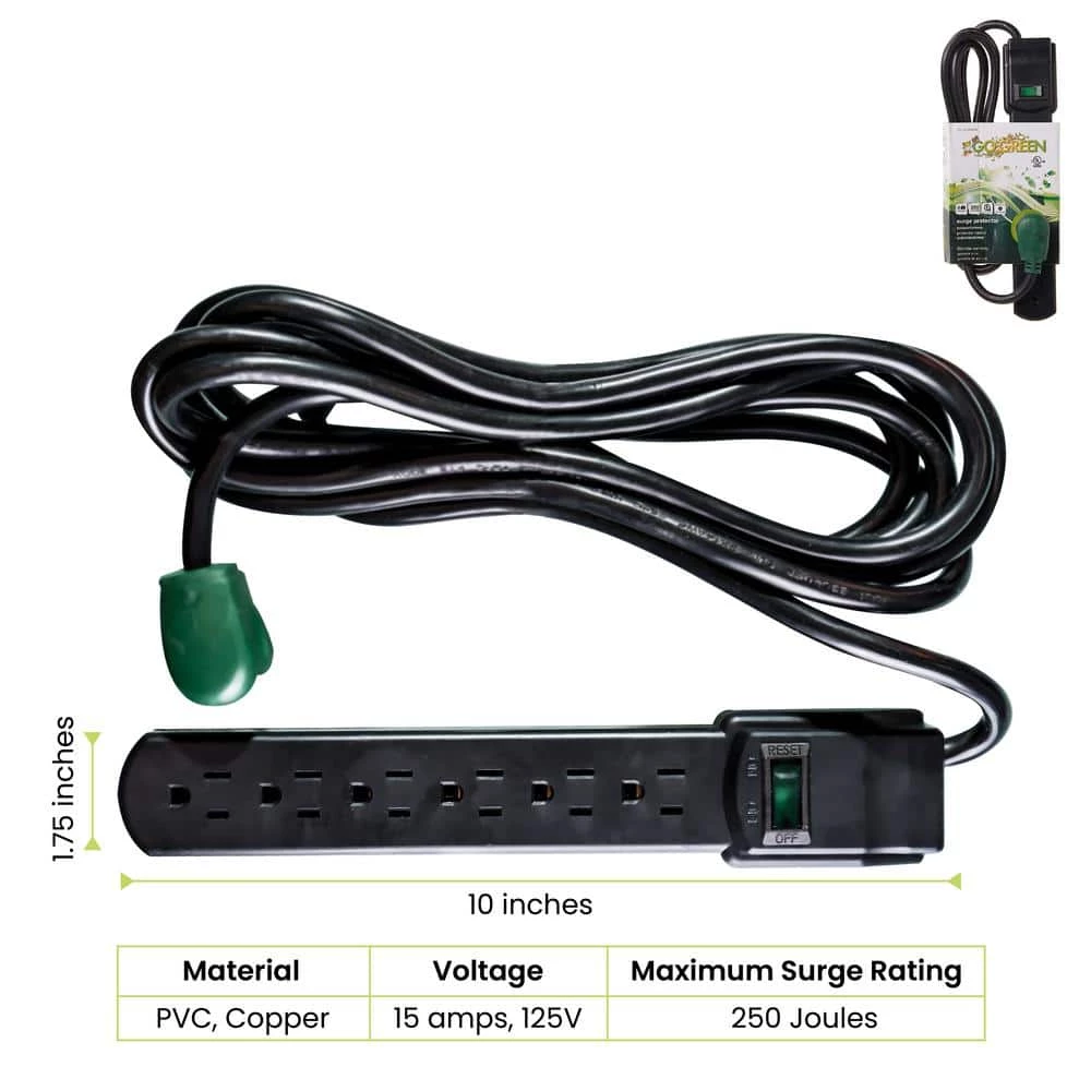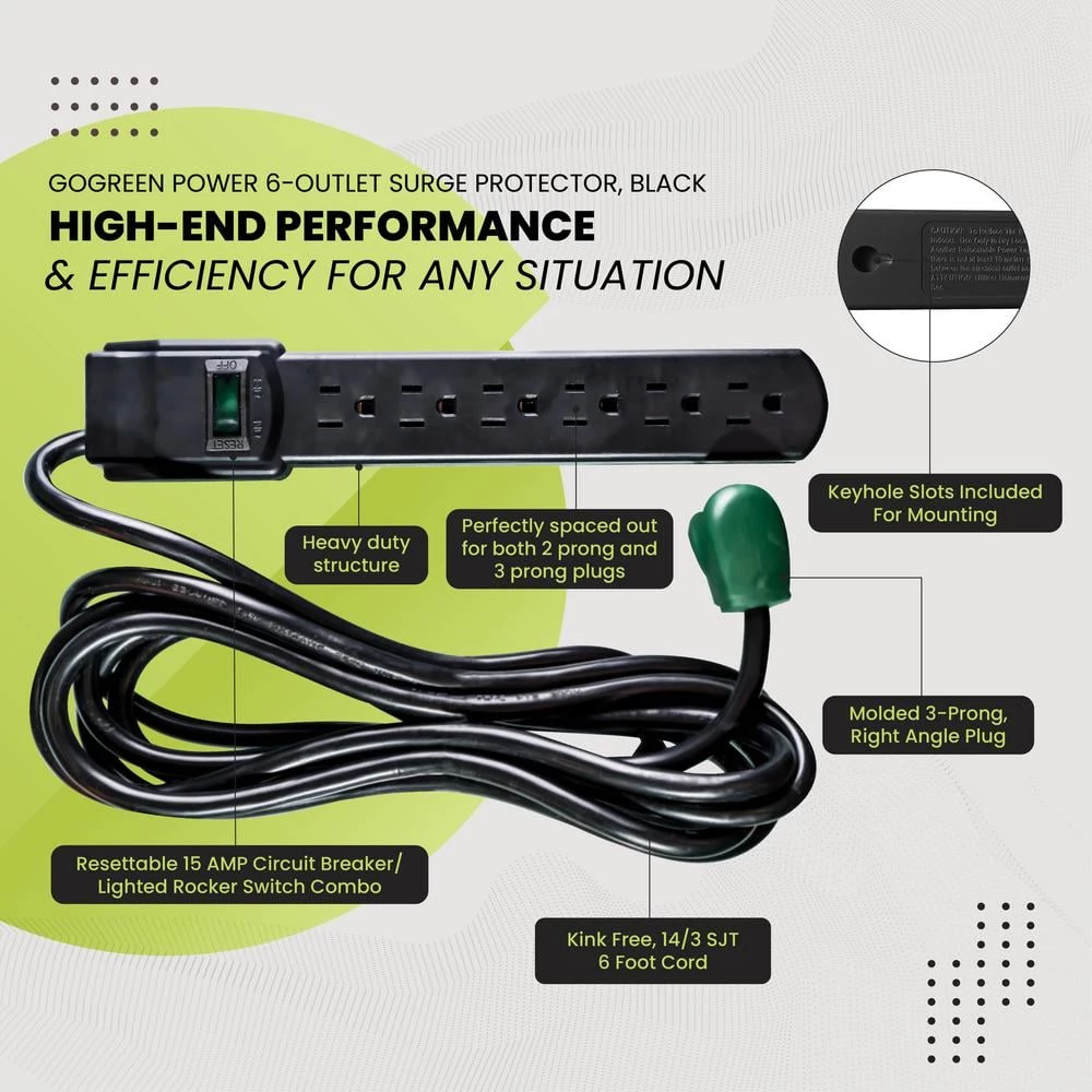 Sometimes you just need something a bit more heavy-duty to protect your computers, video game systems, televisions, and home appliances. Thankfully, the 6-Outlet Surge Protector has you covered with room to spare. With the Go Green Power 6-Outlet Surge Protector, you’ll have peace of mind knowing this 15 Amp, 1,875-Watt circuit breaker is hard at work providing a whopping 250 joules of simultaneous protection for six adapters at once, making it a perfect defense against whatever Mother Nature throws your way. With an active indicator light to confirm operation, the 6-Outlet Surge Protector should be a standard feature in every room in your home. With a right-angle plug and extra-long 6 ft. cord, the Go Green 6-Outlet Surge Protector implements the environmentally-friendly design of all Go Green products with high-end performance and efficiency for any situation.