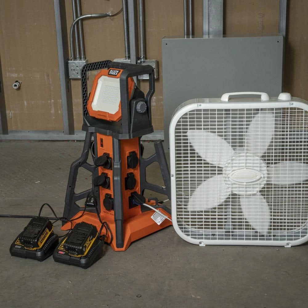 Distribute power and lighting to the jobsite from a central location with the Klein Tools PowerHub (Cat. No. 29610). The space saving, vertical design keeps electrical plugs off the ground by stacking 6 covered, surge protected 120-Volt outlets. The built-in GFCI removes the need for additional GFCI adapters. Brighten up dimly lit areas with the adjustable, 5,000 Lumens LED work light. Easily carry to any location by grabbing the rugged, exoskeleton handles that are conveniently located on the top and sides of the PowerHub.