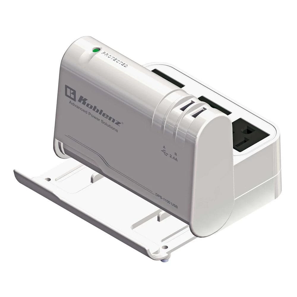 Koblenz Advanced Power Solutions. The electric current in addition to constant supply variations has power peaks that provide very high amounts of energy in shorts periods. Koblenz surge protectors constantly verify power input and, when it detects an excess, specially designed components inside surge protector, absorb it. This way your devices are protected all the time. This Desktop power station comes with 3 grounded outlets designed for easy access, 2 USB ports 2.4 Amp supercharger, Smartphone/tablet retractable base.