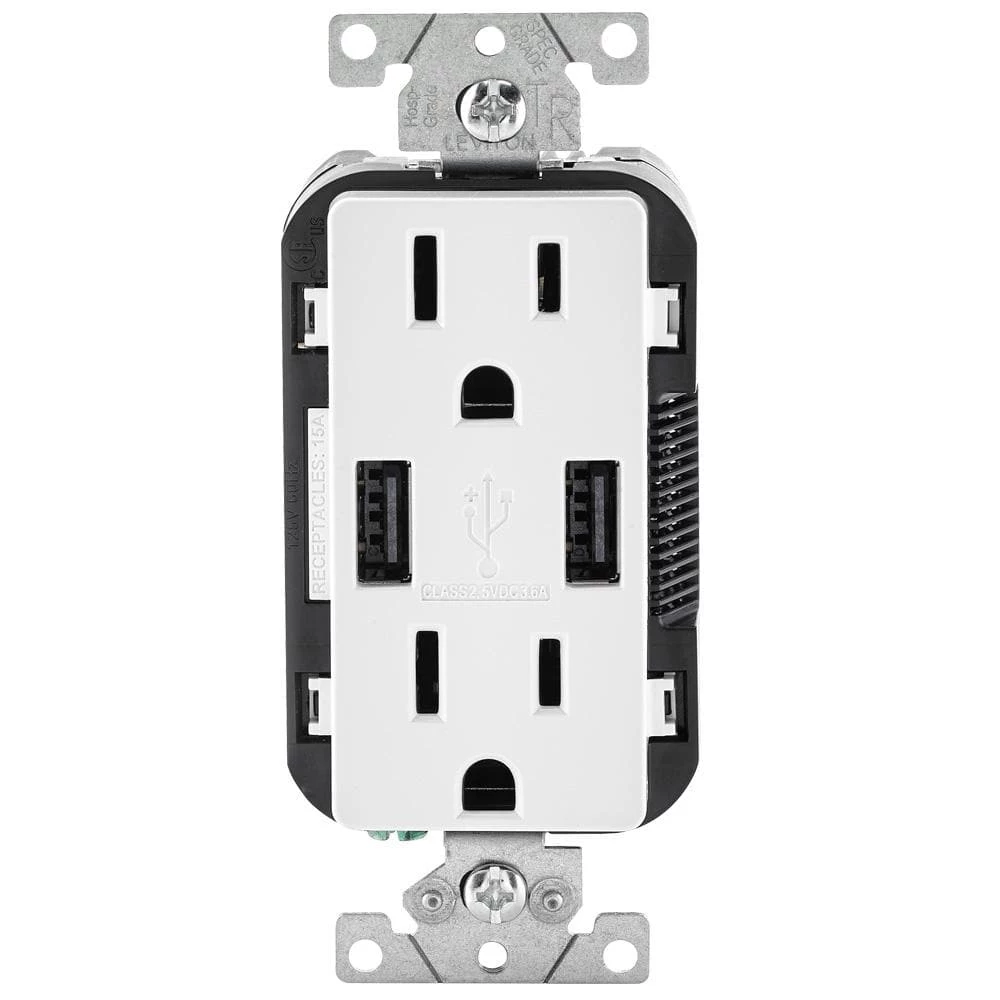 Our USB Charger Devices feature a smart chip that recognizes and optimizes the charging power of your electronic devices for fast and efficient charging. Strategically placed vertical USB Ports in all models provide generous room to insert and maneuver charging cords and add to the contemporary and aesthetically appealing design. Plus, adapter-free charging eliminates unsightly clutter contributing to a neat appearance on countertops, desktops or wherever you choose to charge. Engineered for compatibility with the latest technology, Leviton USB Charger Devices are designed to charge tablets, smart and mobile phones, gaming devices, e-readers, digital cameras and a host of other electronic devices.