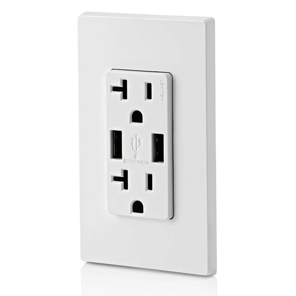 The Leviton USB Charger/Tamper-Resistant Duplex Receptacle offers 2 high-powered USB Ports with 5.1 Amp of charging power and two 20 Amp or 20 Amp/125-Volt Tamper-Resistant Receptacles. It has the capability to charge 2-USB powered electronic devices utilizing its 2-USB Ports, leaving the 2 tamper-Resistant Receptacles free for other uses. The Leviton USB charger/tamper-resistant duplex receptacle is designed to charge tablets, smart and mobile phones, gaming devices, e-readers, digital cameras and a host of other electronic devices.