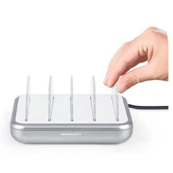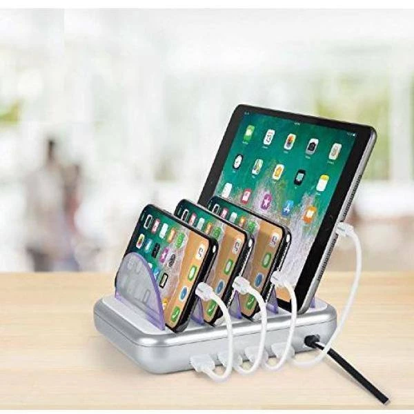 The 4-port charging station holds all your mobile devices neatly in place as it delivers optimum power for lighting quick charging. The sleek and supremely convenient design ends the days of struggling to find numerous outlets, cords and ports to charge all of your devices. The 4 Port Charging station is a fully customizable base with 5 translucent stands that can be shifted and/or removed to accommodate any size smartphone or tablet.
