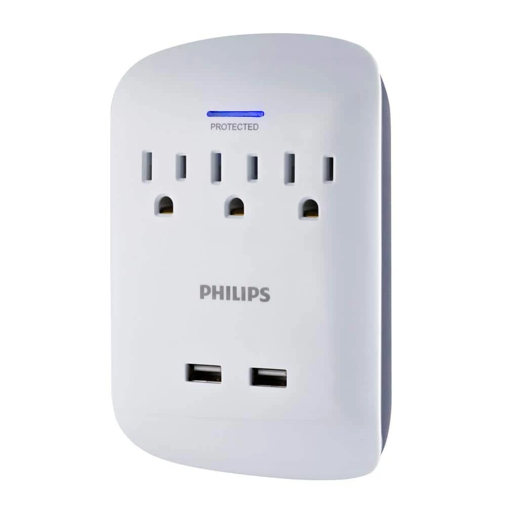 Charge and power all your devices at once with the Philips 3-Outlet Surge Protector with 2 USB Ports. Featuring three grounded outlets and 2 USB charging ports, the wall surge protector transforms your regular outlet into an efficient, multipurpose charging station. The USB charging ports reduce the need for additional charging blocks and adapters. The space saving surge protector design is ideal for placement in any room in your home, regardless of size or layout. In the event of a power surge, the wall tap includes 900 joules of surge protection to keep your connected devices safe from damage, while the LED indicator light stays on to let you know your surge protector is functioning properly. Use the Philips wall surge protector as part of your permanent home or office setup or, for holidays and special occasions, create a centralized location for powering a room’s worth of electronic lights and decorations. Get the most from your outlet with the Philips 900 Joule Surge Protector with 2 USB Ports.