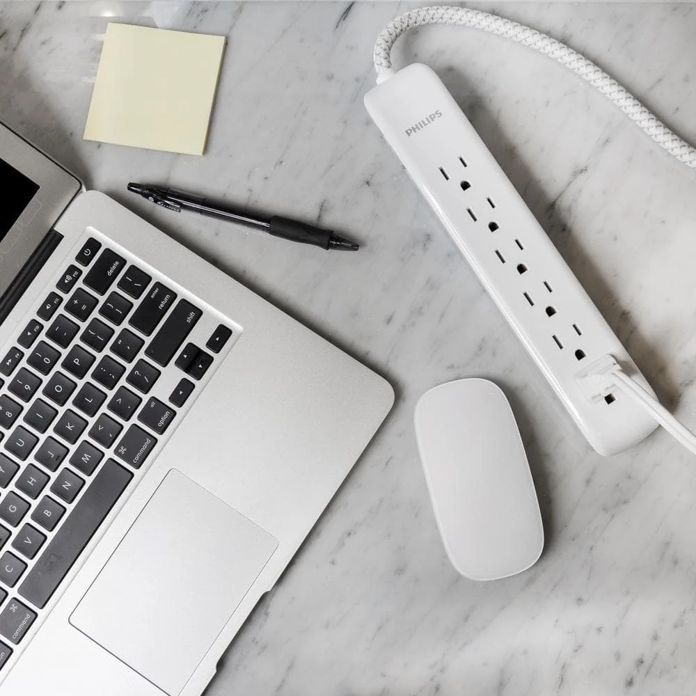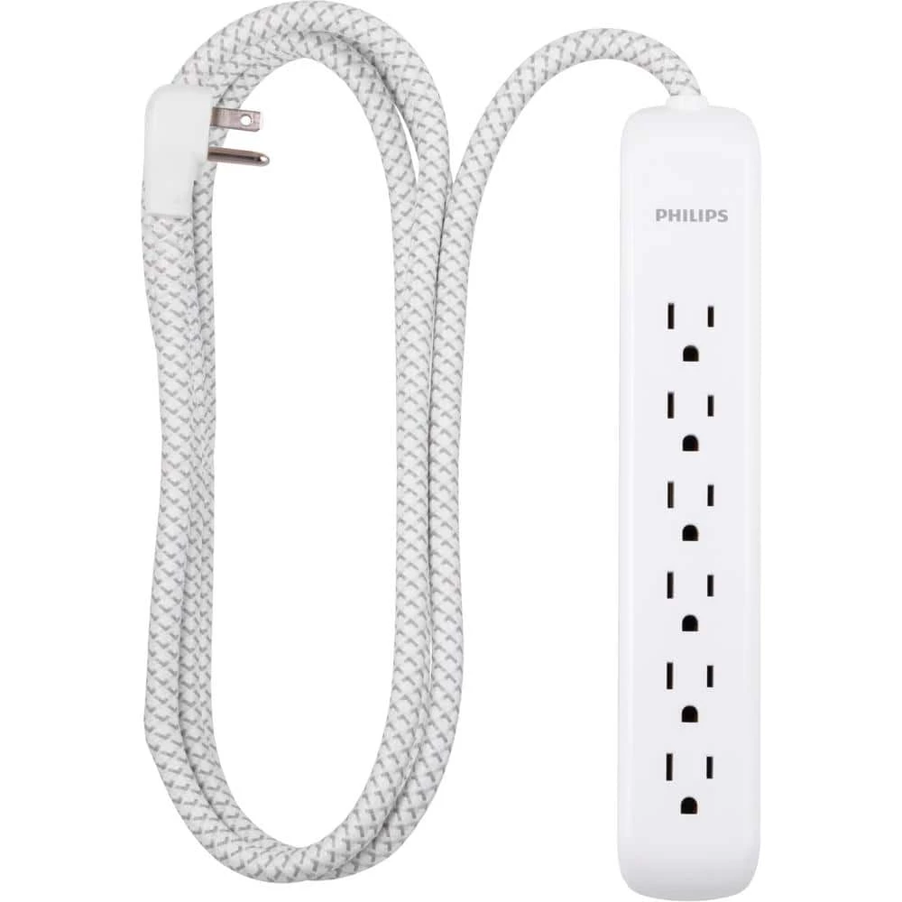 Your power does more with the Philips 6-Outlet Surge Protector. Converting one three-prong outlet into six, this powerful extension cord adds more outlets where you need them most and keeps your electronics protected from dangerous power surges. The surge protector features an integrated circuit breaker that protects your electronics if the capacity is exceeded by a power surge and automatic shutdown technology to cut power if the components expire. It also features a surge protection rating of 1080 Joules to ensure your electronics are safeguarded from voltage spikes. The surge protectors extra-long 6 ft. braided fabric power cord is connected to a flat plug, allowing it to plug in easily behind desks, sofas and other furniture. Featuring a white and gray pattern, the decorative, woven fabric increases the cables durability, is tangle-resistant and adds instant style to any space. For use in grounded (three-prong) outlets only, this product comes equipped with a $100,000 connected equipment guarantee and is backed by a limited-lifetime warranty. Your outlet deserves an upgrade with the Philips 6-Outlet Surge Protector.