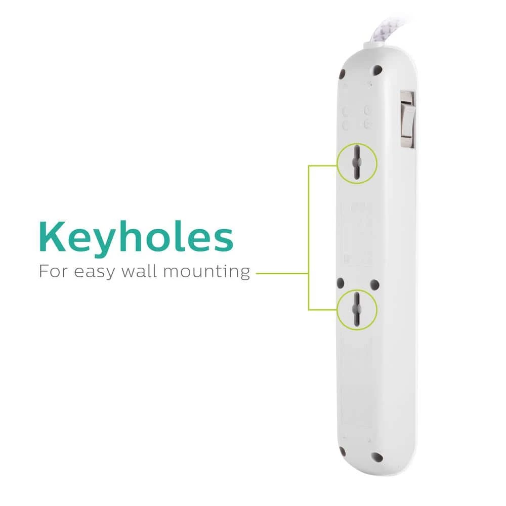 Power and protect your devices with the Philips 6 Outlet Surge Protector Power Strip. This powering station features 6 grounded AC outlets and 1080 joules of surge protection to ensure your equipment is safe from unexpected power spikes. Automatic shutdown technology provides even more protection by cutting power to your connected devices the moment surge protection expires. The extra-long 10 ft. power cord with flat plug allows the surge protector to fit easily behind desks, sofas and other furniture, while the built-in keyhole slots allow for easy mounting to a wall or under a desk, cabinet or countertop. Additionally, the braided cord creates a stylish look while keeping tangles at bay. These features make it the perfect addition to your home office, entertainment center or workspace. Safeguard and power your valuable electronics with the Philips 6 Outlet Surge Protector.