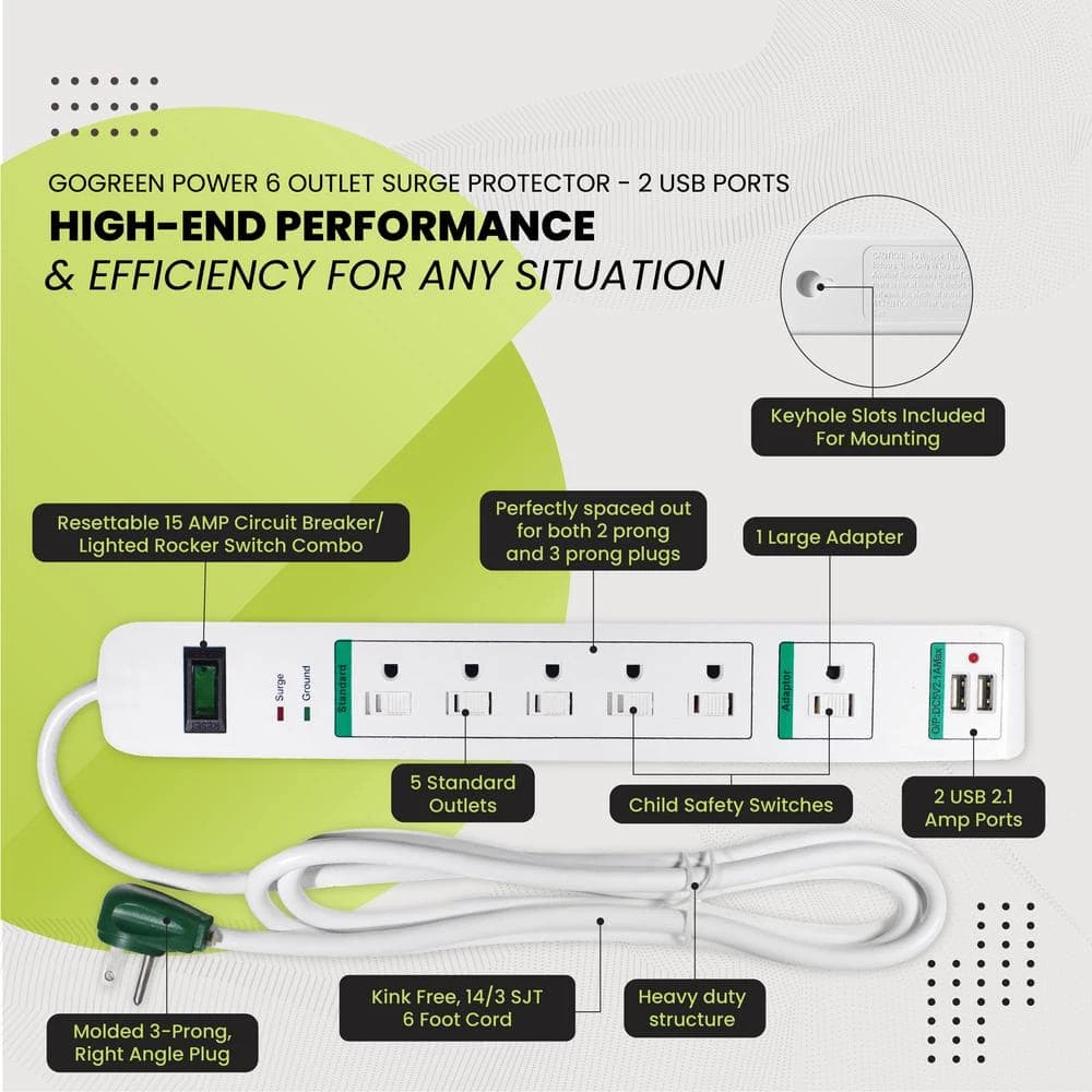 Whoever said good things come in small packages must have been talking about the 6-Outlet Surge Protector w/USB by GoGreen Power. Designed for peak performance for users on the go, the 6-Outlet Surge Protector w/USB by GoGreen protects your electronics while giving you that much-needed place to park your phone, tablet, or other USB devices for charging. ? ? The GoGreen 6-Outlet Surge Protector w/USB sports a 15 Amp, 1875-Watt circuit breaker providing an incredible 1,600 joules of simultaneous protection for five standard outlets, one large adapter, and two USB ports at once. The compact design includes an indicator light verifying you have active protection at all times, and industry standard EMI/RFI shielding means you’ll never have to wonder about performance or safety. ? With a right-angle plug and a 6 ft. cord, the GoGreen 6-Outlet Surge Protector w/USB puts power and protection right at your fingertips. And with the environmentally-friendly design of all GoGreen products, you can focus on the task at hand knowing your computers, appliances, and other electronic devices are safe and sound. We have all thrown our items in the trash, even though it always says on the package dispose of properly. Everyone wants to recycle, but not change their lifestyle. We want to make it easy for you to recycle comfortably from your home or office. Its Free. Enter our Power By GoGreen code at www.iRecycled.com