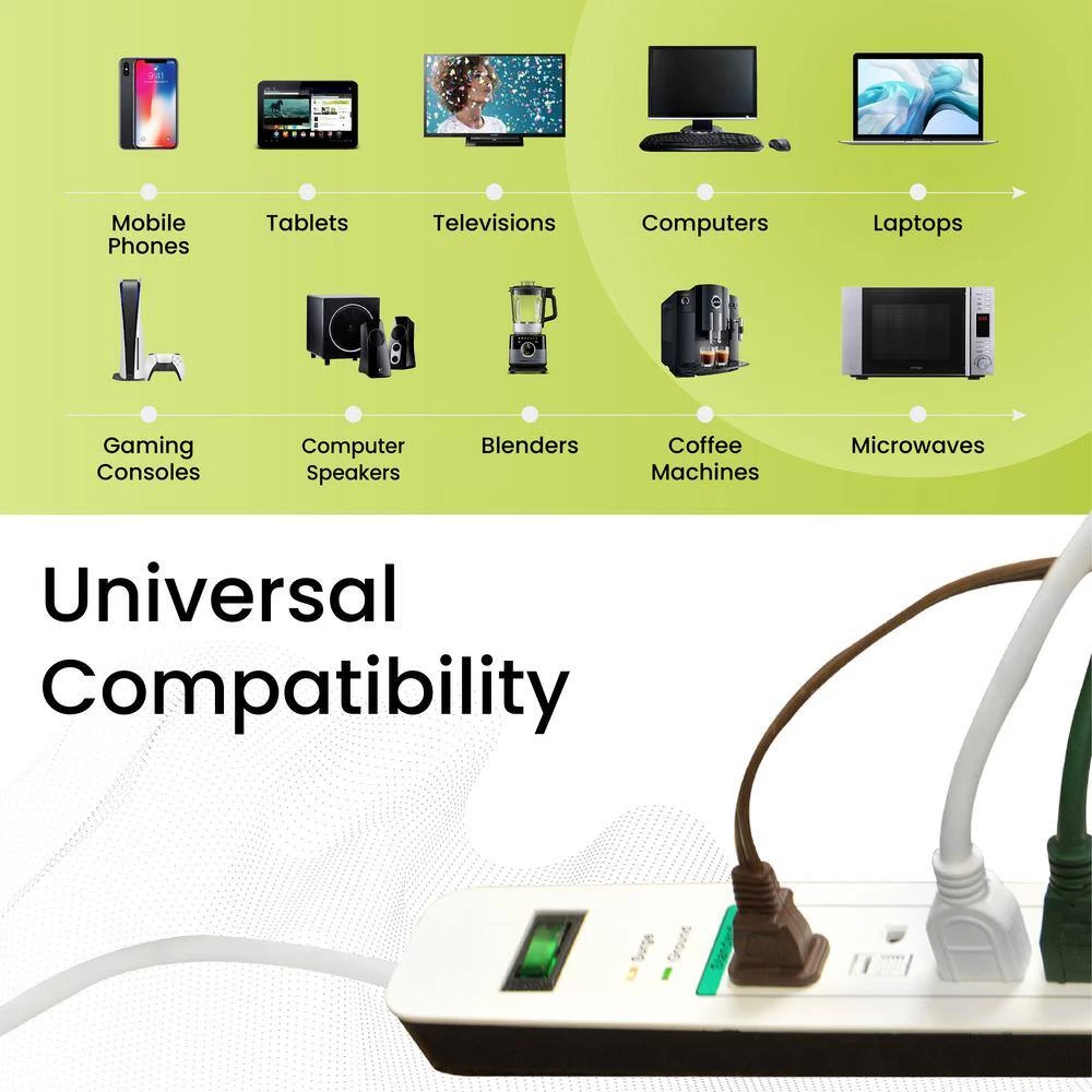 - 5 standard outlets, 1 large adapter, 2 USB ports