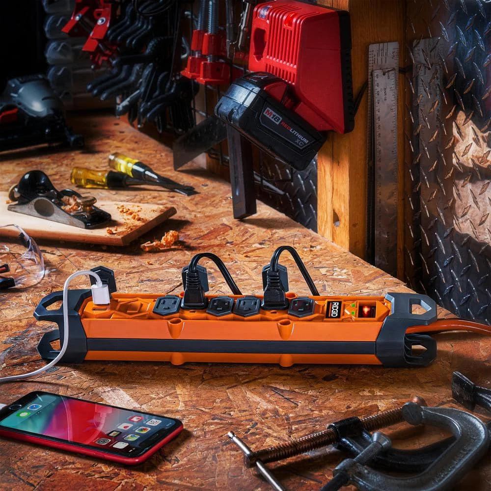 The RIDGID RG608U Surge Protect or prevents spikes in energy caused by storms and electrical power surges from reaching your valuable devices such as power tools, lights, audio/video equipment, laptops and desk top computers, household appliances and small electronics. The RG608U provides 2100 Joules of surge protection, 6 AC outlets, 2 USB-A charging ports and an 8 ft. power cord with a straight, grounded plug. Limited Lifetime Warranty Covers defects in materials and workmanship in the product under normal use and conditions. See warranty for details.