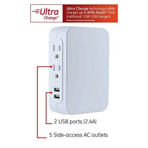 Power, charge, and protect your devices all at once with this Surge Protector Tap from GE. This product features easy side access to 5 outlets and 2 USB ports to accommodate tight spaces. This makes it perfect for entertainment centers, tv wall mounts, couches, and more. Ultra charge technology safely charges mobile devices up to 40% faster than traditional 5W USB chargers. Utilize the fast charging USB ports for your Fire stick, Roku, Apple TV, and more. The UltraPro 5 outlet + 2 USB charging side access surge protector tap ensures the safety of your valuable mobile and electronic devices with a 560 Joules protection rating and up to $50,000 connected equipment warranty. This tap features automatic shutdown technology that stops power to electronic equipment when the surge protector reaches its end of life.