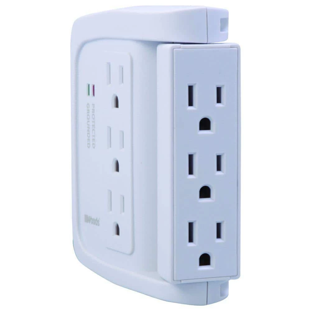 Save space with the versatile Woods 6 outlet space Saver swivel surge protector. 3-outlets rotate 90°, 3-outlets face out. 1440 joules protects your electronics against surges.