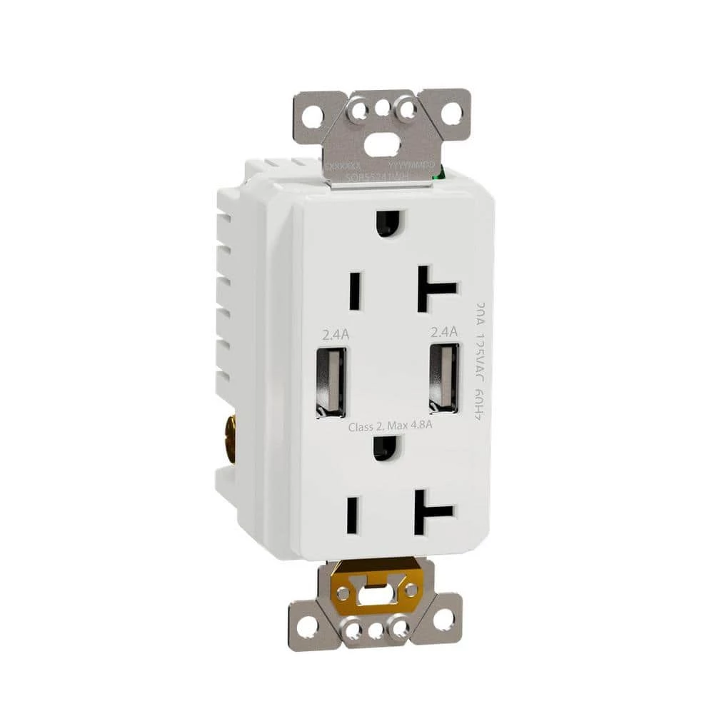 The Square D X Series USB A/A Duplex Decorator Tamper Resistant Outlet with back wire clamps combines a traditional receptacle with modern USB-A charging into a single receptacle. Use both USB-A ports to charge two devices at the same, adding time-saving convenience to your home. Wiring and installation is fast and easy with back wire pressure plate and ground screw pressure plate. Complete the look with one of the Square D X Series cover plates (not provided) that easily snaps into place for a modern, flush-facing finish to your walls. Enjoy a consistent look across your room or home with the full line of Square D X Series switches, dimmers, sensors, and receptacles.