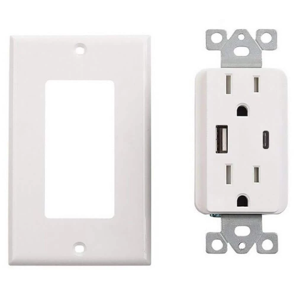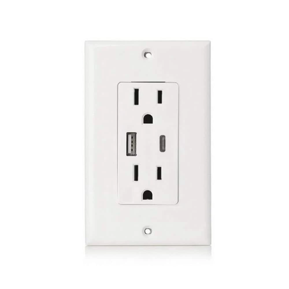 Electrical receptacle with 2 high power USB ports- Charge 2 devices simultaneously with ultra-high speed USB-A and USB-C ports USB-C port capacity of 3A/5V/15W, USB-A port capacity of 2.4A/5V/12W, total USB output 4.8 Amp/5VDC/24-Watt when used simultaneously- Smart intelliChip USB ports precisely read the power needed to maximize charging efficiency up to the port capacity or up to what the charged device allows without overcharging Does not support Qualcomm Quick Charge technology. Does not effectively charge USB-C laptops, such as MacBook Pro, HP Spectre, etc. that require higher power charger Two 15 Amp/120VAC with no restrictions- Replaces in-wall outlet, using existing junction box and wiring. Box need to accommodate the electrical wires and the new receptacle of 1.7 inc depth..