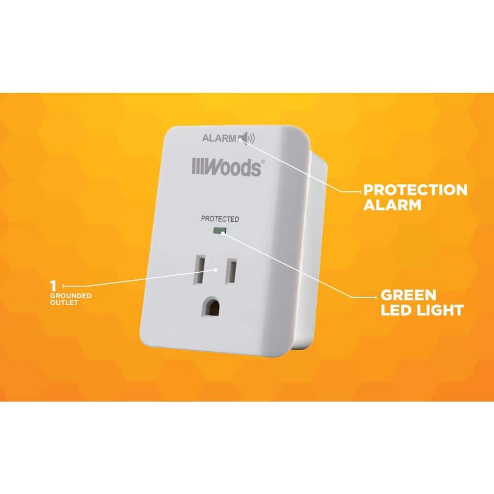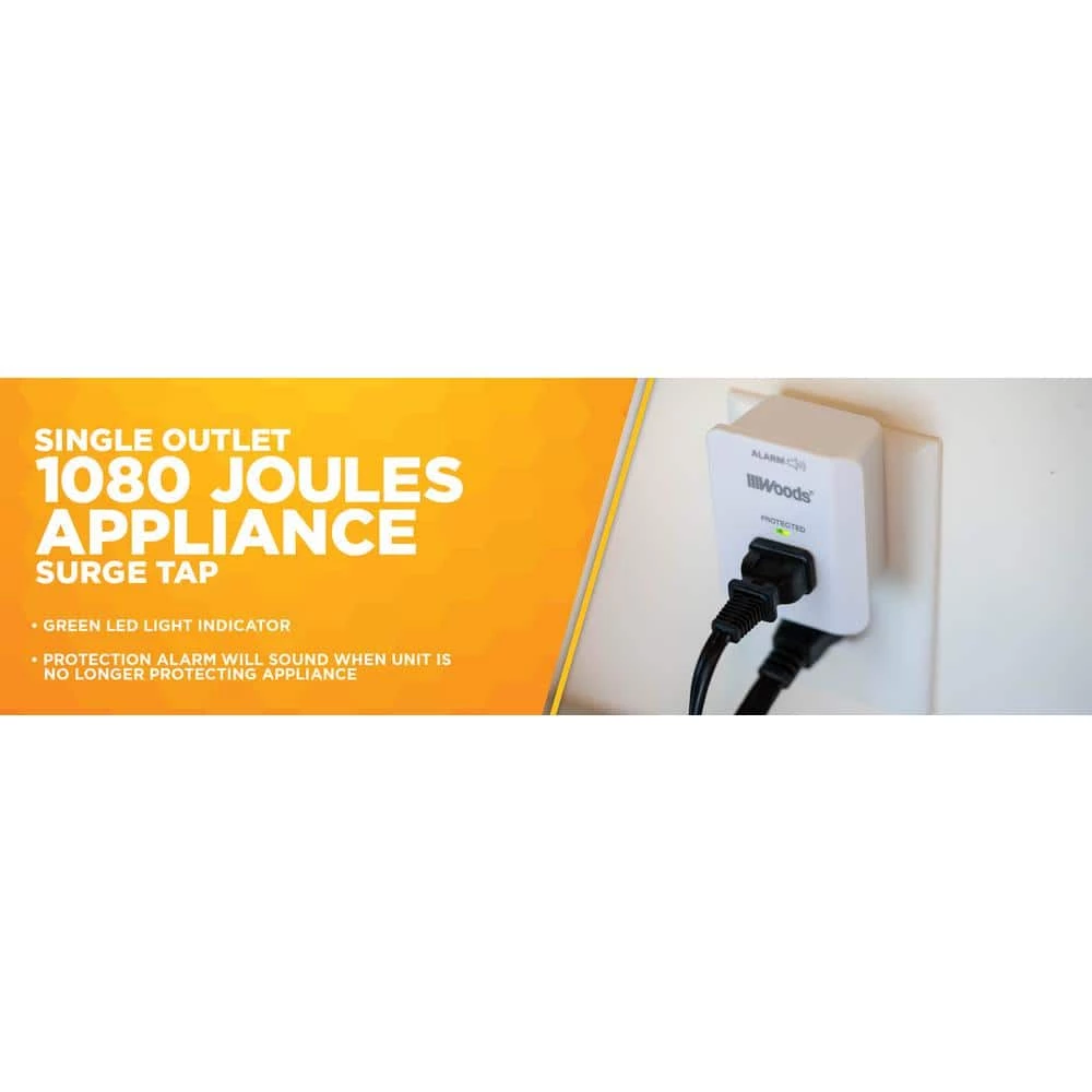 Woods Appliance Surge Protector protects your appliances from power surges. When the unit is no longer protecting, it will sound an alarm. Includes upgraded 1080-Joules.