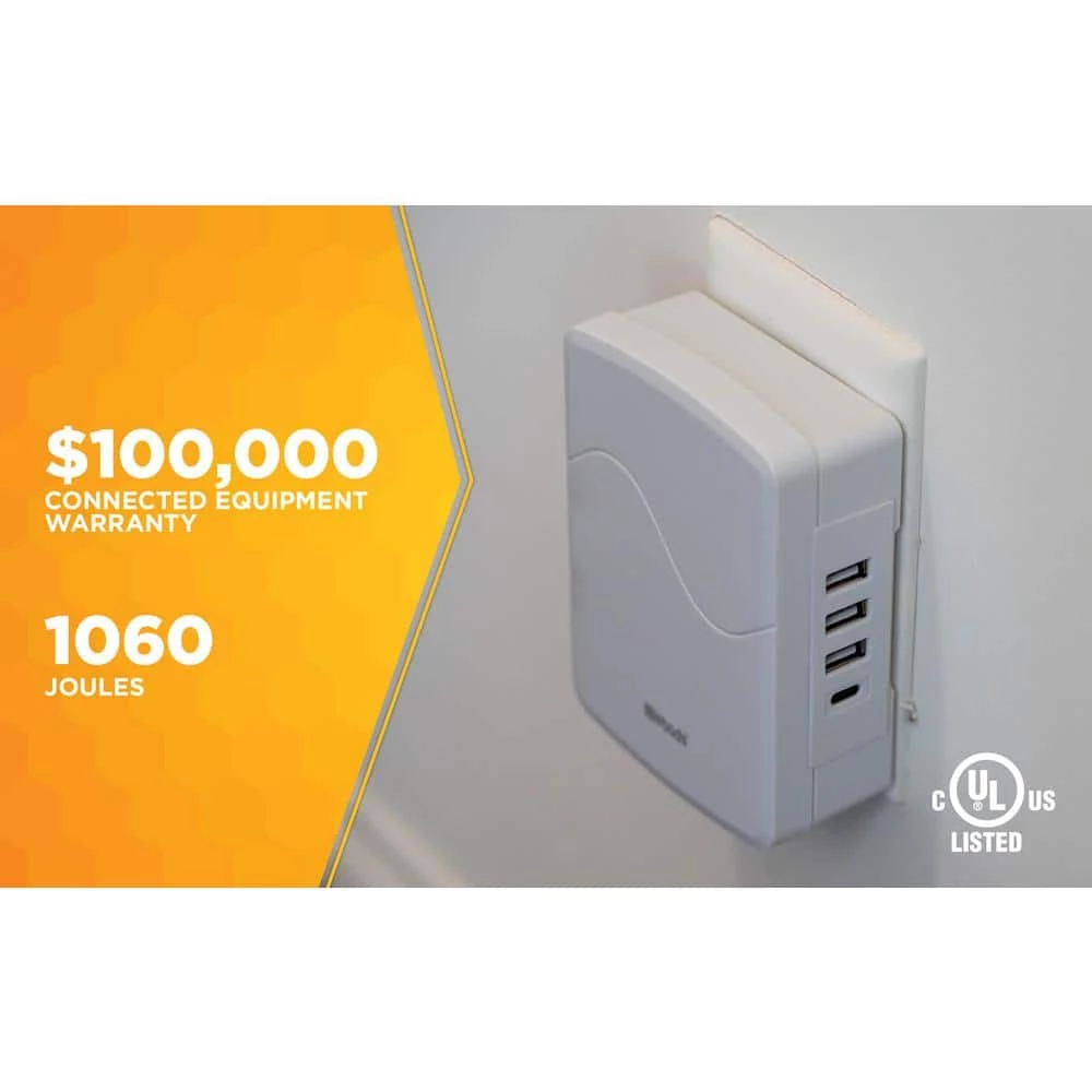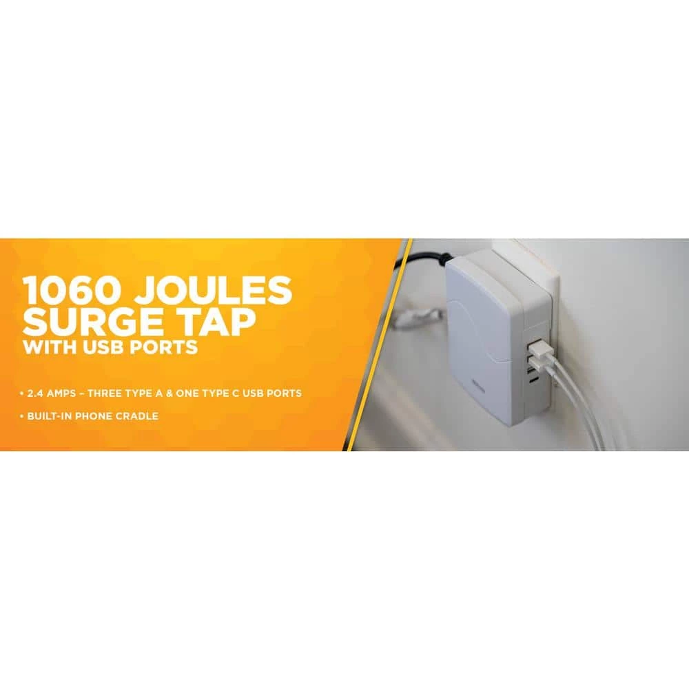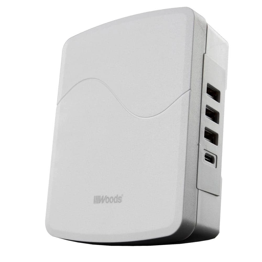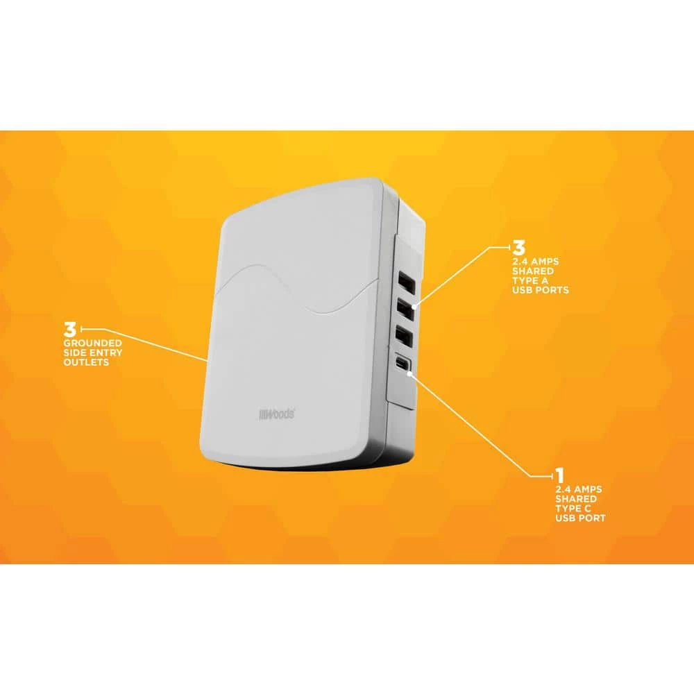 Woods 3-Outlet USB Side Entry Surge Protector with 4 USB ports (1 USB-C and 3 USB-A) with 2.4A and adds user-friendly features like phone cradle, safety covers, wire wrap and EZ-Pull. You can conveniently place your phone on the-Outlet and neatly wrap the cord for a clutter-free-Outlet. Perfect for your home, office, or any living space.